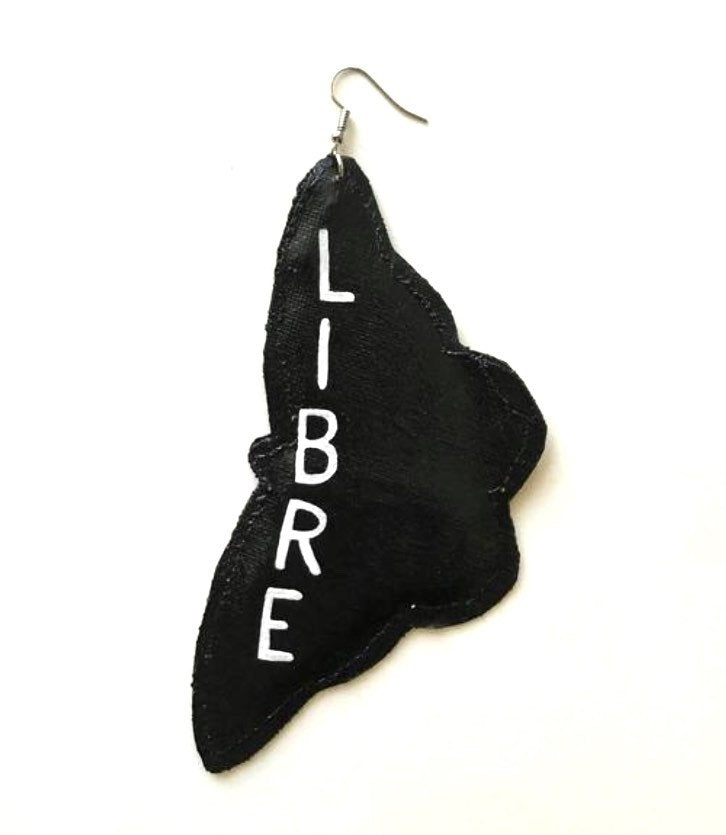 Monarch Butterfly Statement Earrings. The front of each earring depicts a Monarch butterfly in shades of orange, black brown, and white. The back of each earring is black with the word "Libre" painted in white.